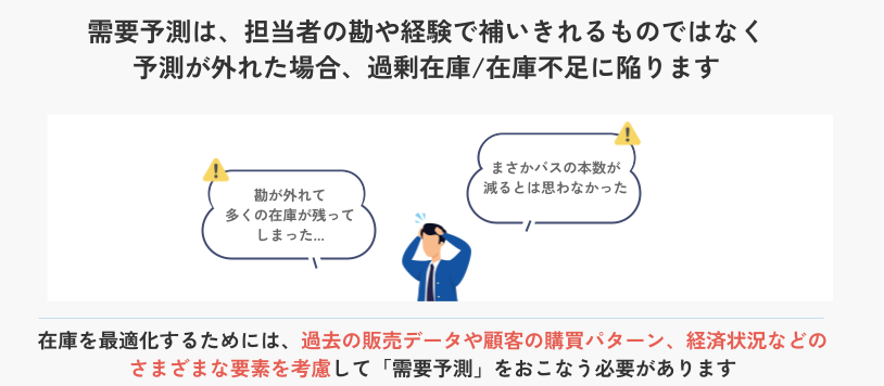 特に、需要予測だけが独立していて、発注量の算出まで連動していない場合、在庫の最適化にはつながりません。
