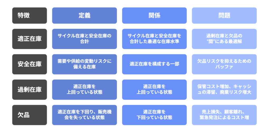 このように、安全在庫は欠品リスクを抑えるためのバッファであり、適正在庫はそれを含めた「全体として最適な在庫量」を意味します。
