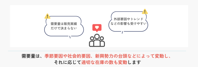 精度の高い適正在庫を設計するには、需要予測はほぼ必須です。平均販売数だけでは、季節変動や急な需要変化に対応できません。将来需要を見込んだ設計が、欠品防止と在庫削減の両立につながります。