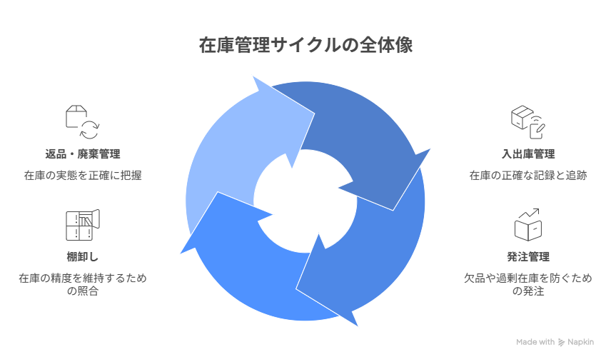 在庫管理と一口に言っても、その業務内容は多岐にわたります。単に在庫数を把握するだけではなく、入出庫・発注・棚卸し・返品対応など、在庫に関わる一連の業務を統合的に管理することが求められます。
