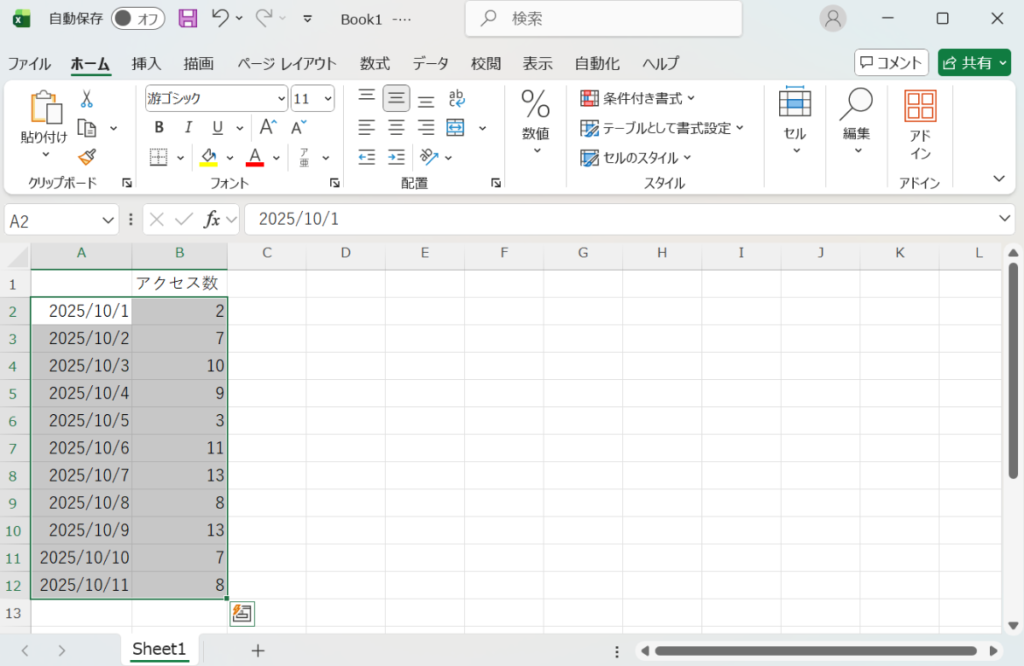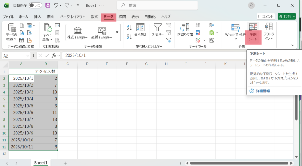 まず、予測したい数値データ(例:売上やアクセス数など)をシートに入力します。