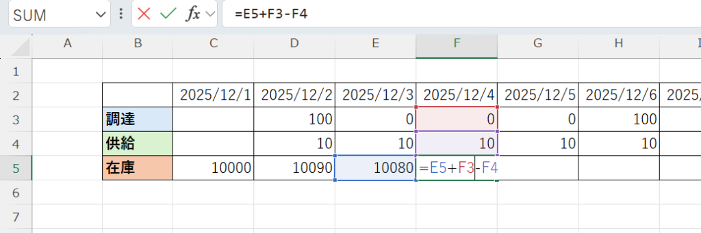 次に調達と供給と在庫の関係の式をいれます。