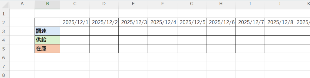まず、新しいExcelシートを開き、「調達(入庫)」「供給(出庫)」「在庫」の3つの行を用意します。
