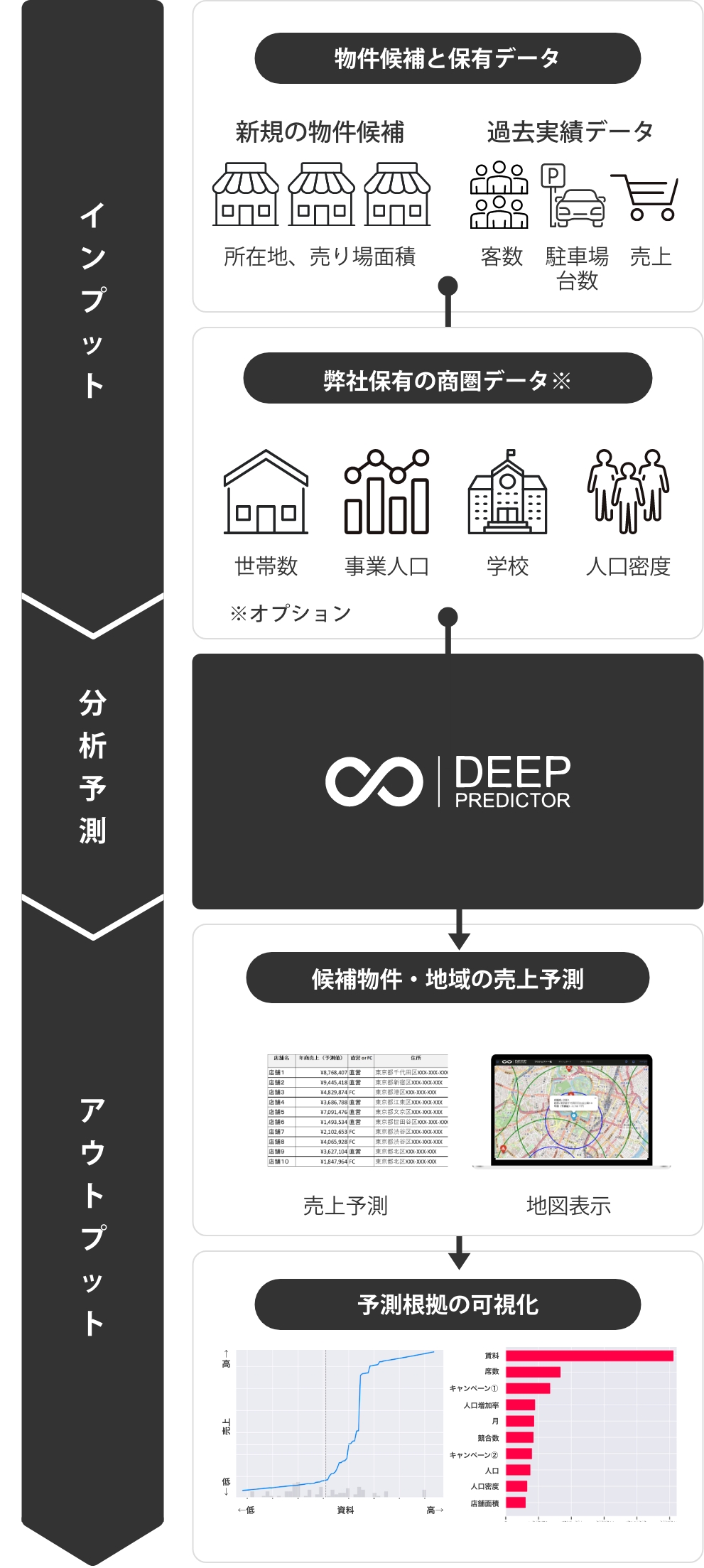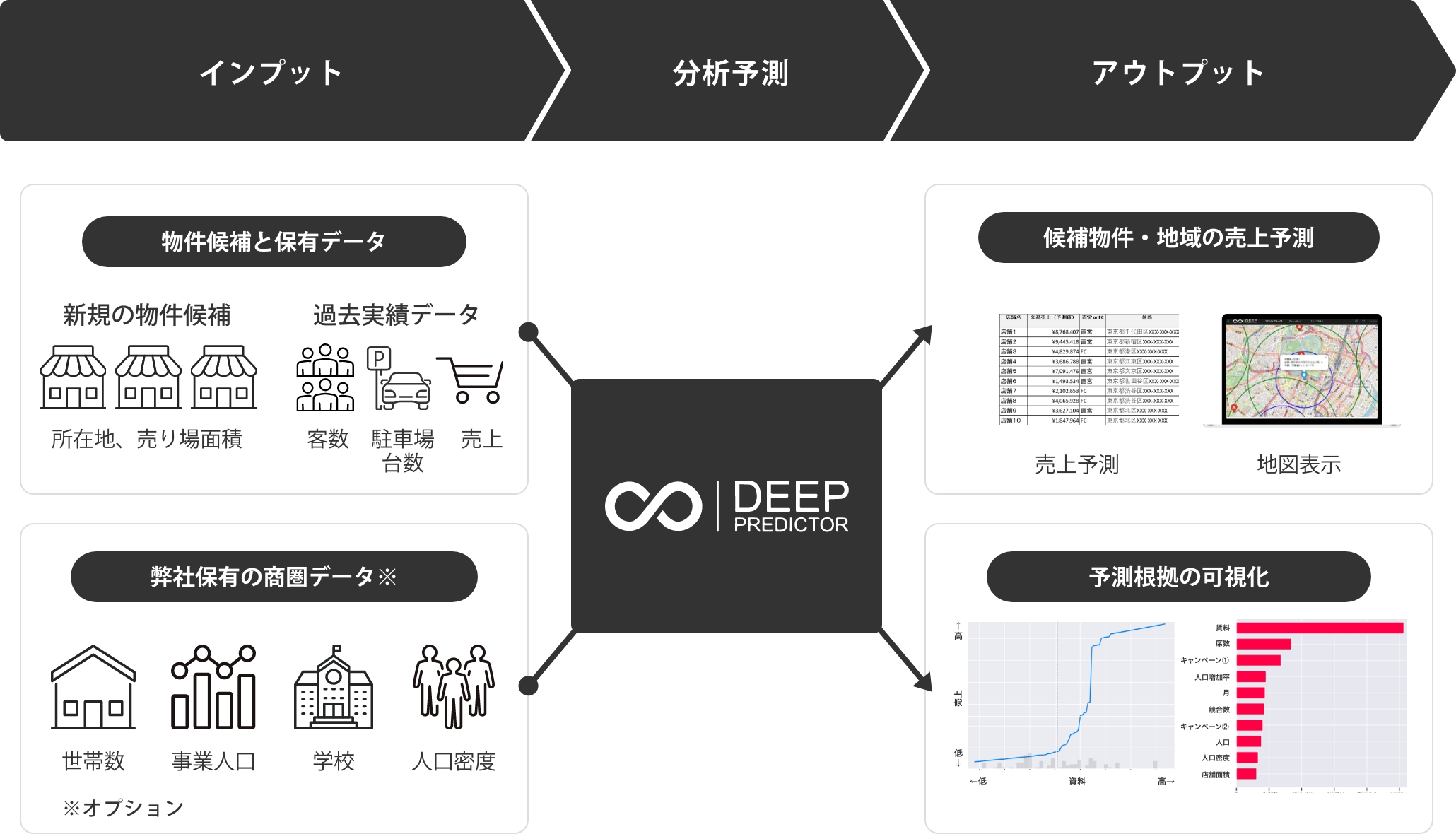 「Deep Predictor」はお客様の保有データと商圏データを組み合わせた高精度な売上予測によって、
