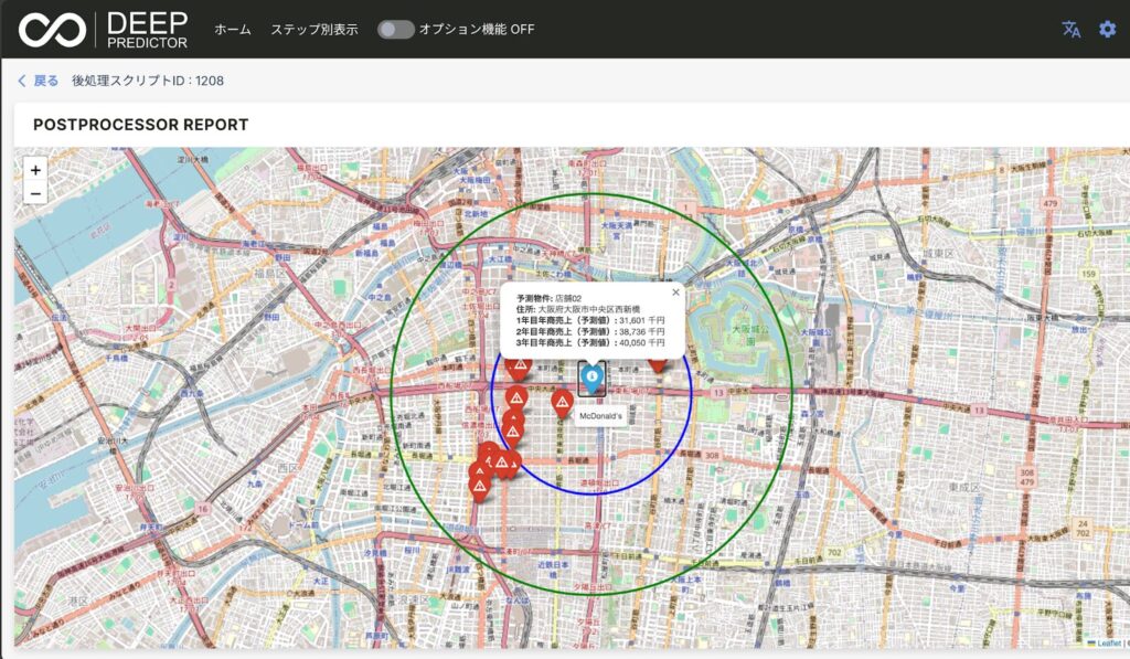 店舗別の予測売上と商圏範囲・競合店舗との位置関係を地図上で可視化