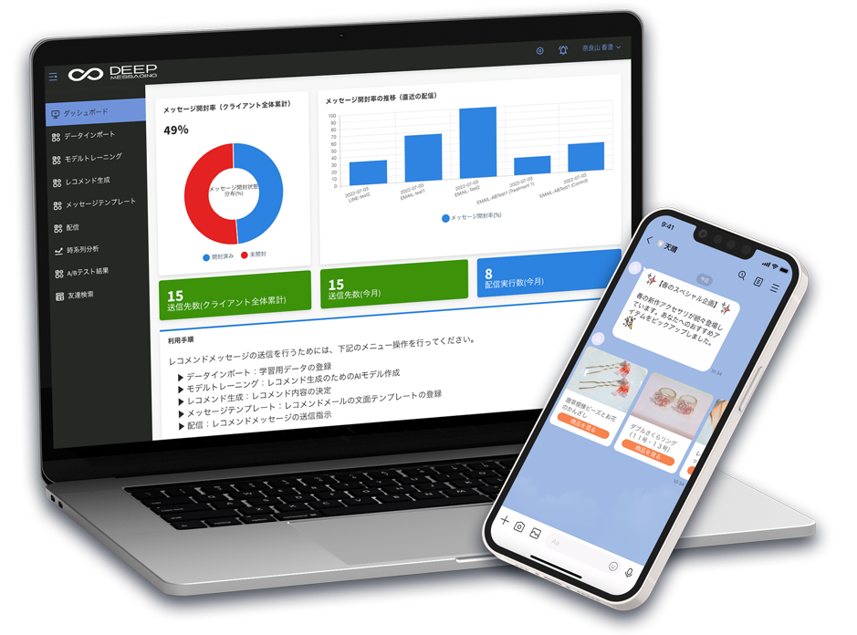 Deep Messagingは、最先端のレコメンドAIエンジン搭載のノーコード・数クリックでレコメンド生成ができます。マルチチャネル対応の配信管理画面で、最適な配信、効果測定が可能になります。また、データサイエンティストが課題設計から導入・運用のトータル支援します。